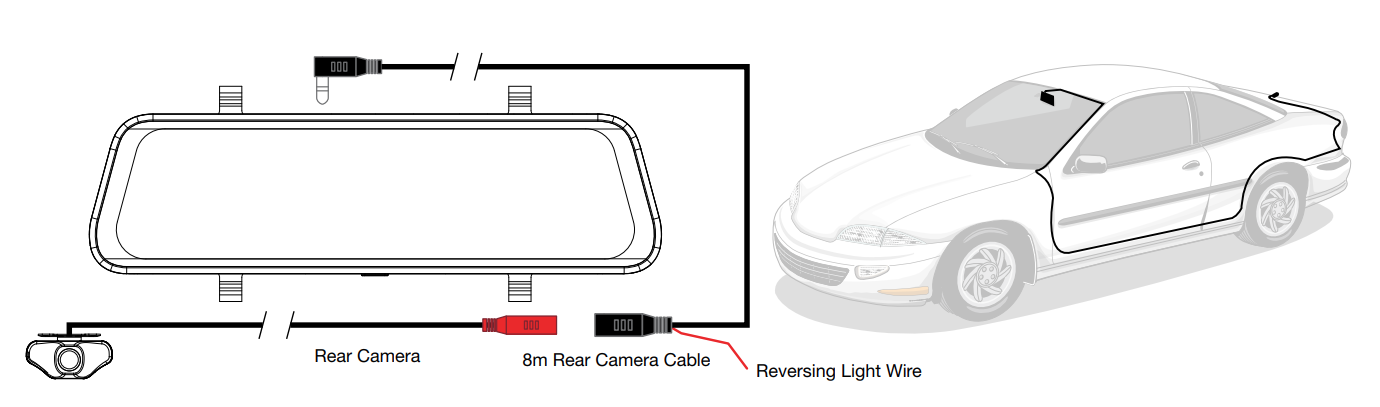 Once securely mounted, connect the mirror to power using the provided 12V DC power adaptor into the vehicle's 12V/24V accessory outlet. Follow the illustration below to line the cables to the outlet from the mirror.